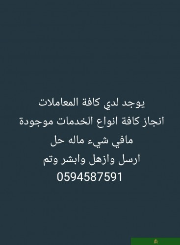 السلام عليكم ورحمة الله وبركاته خدمات عامه انجاز كافة انواع الخدمات موجودة ارسل وازهل وابشر وتم وازهلها انجاز كافة المعاملات جوازات اقامات كل شيء واتس اب 0594587591